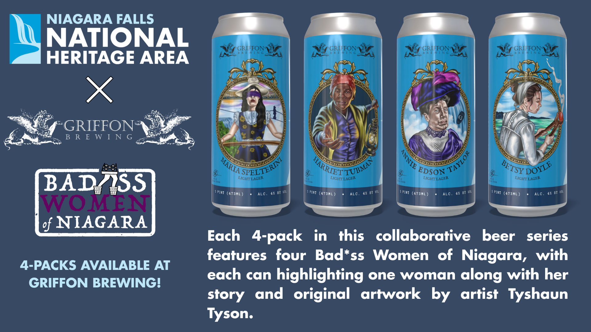 Each four-pack includes four different cans, with each can dedicated to one of these women. The labels feature original artwork by Niagara Falls artist Tyshawn Tyson, along with a short story about the woman depicted so drinkers can learn a bit of local history while enjoying the beer.
